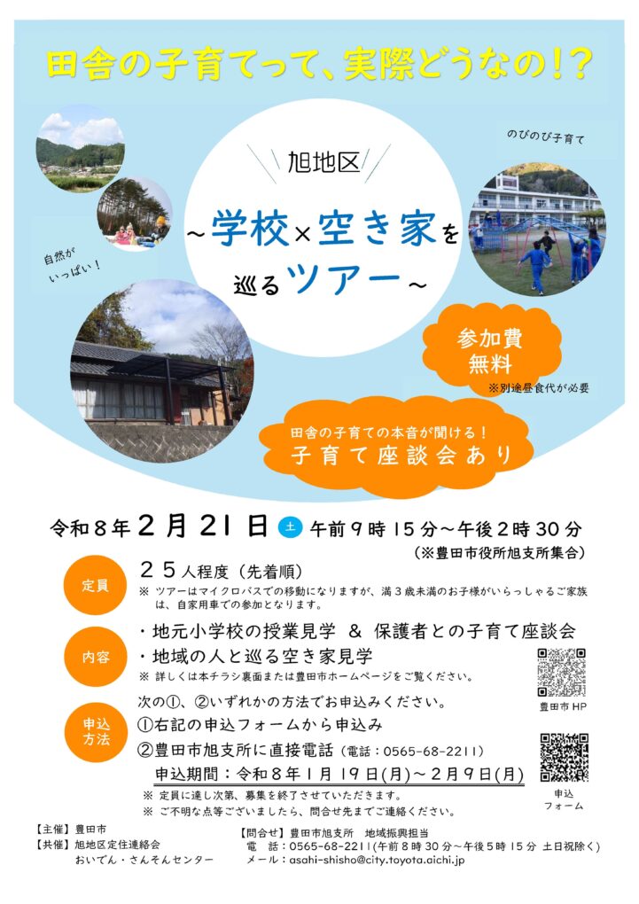 子育て世代を対象にした「旭地区 学校×空き家を巡るツアー」の参加者を募集します!